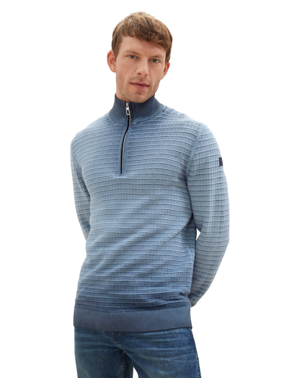 De perfecte herfsttrui voor mannen, dat is deze blauwe Tom Tailor trui! Het effen blauwe design met een subtiele melée print geeft de trui een tijdloze uitstraling. De lange mouwen en opstaande kraag houden je lekker warm op koude dagen. De halve ritssluiting aan de voorzijde zorgt voor een stoere touch en maakt het gemakkelijk om de trui aan en uit te trekken. Het vierkante motief detail in de stof maakt deze trui helemaal af. De trui is gemaakt van 100% katoen en voelt daardoor heerlijk zacht en comfortabel aan op de huid. Kortom, een must-have voor elke man zijn kledingkast. Shop nu deze stijlvolle Tom Tailor trui in onze webshop en geniet van een warme en trendy look!